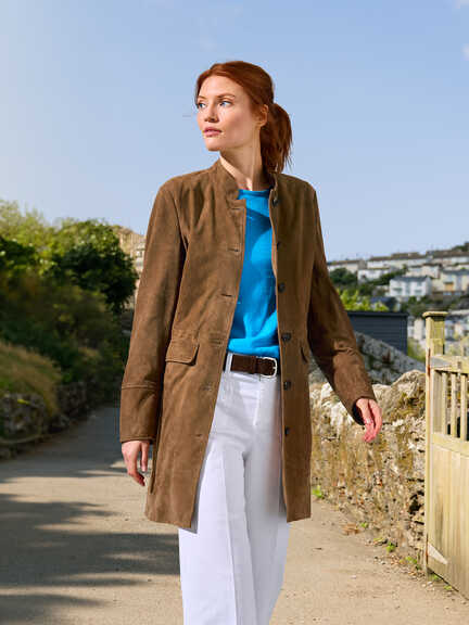 Dieses Ensemble definiert den klassischen "Casual Friday" auf britische Art neu. Im Mittelpunkt steht der taillierte Veloursleder-Blazer, der die Strenge eines klassischen Blazers durch die weiche Haptik des Naturmaterials ersetzt. Das Strickpolo in leuchtendem Koralle setzt unter dem erdigen Braunton des Blazers ein selbstbewusstes, frisches Statement. Und die klassische Blue Jeans nimmt dem Outfit die offizielle Schwere. Sie signalisiert Dynamik und macht den Look alltagstauglich für das kreative Meeting oder den Termin in der Agentur.