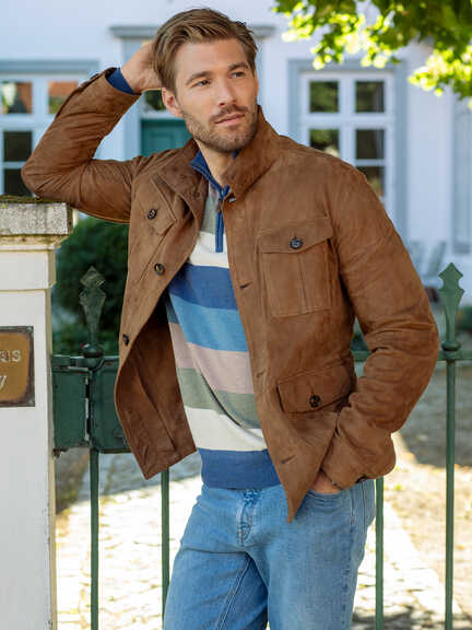 Dieses Outfit beweist, wie mühelos sich maskuline Robustheit mit entspannter Eleganz verbinden lässt. Im Zentrum steht die Velourslederjacke im klassischen Field-Jacket-Stil. Die markanten aufgesetzten Taschen unterstreichen den typisch britischen Utility-Charakter – praktisch und stilvoll zugleich. Für einen frischen Akzent sorgt der Troyer mit Blockstreifen. Und die hellblaue Denimjeans macht den Look alltagstauglich. Ein subtiler Beweis für Stilbewusstsein, ohne angestrengt zu wirken.