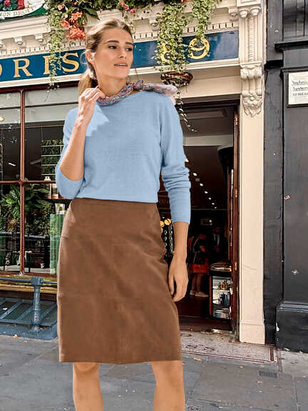 Dieser Look inszeniert den Veloursleder-Gehrock als Herzstück eines souveränen und entspannten Ensembles. Der warme Cognac-Ton des Leders erdet das Outfit. Die Kombination bricht bewusst mit formaler Strenge und schafft eine moderne Dynamik durch den Materialkontrast. Das raue, edle Veloursleder des Mantels trifft auf leichten Sommerstrick. Weite Schnittführung und 7/8-Länge der Culotte nehmen dem Mantel seine optische Schwere und verleihen dem Gesamtbild eine sommerliche Leichtigkeit. Und der azurblaue Pullover bringt einen energischen, frischen Akzent.