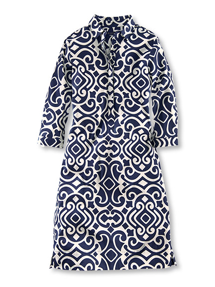 "British Lifestyle" Waistcoat Poloshirt Größenberater Hemdbluse "Country Style" StreifenshirtEin Muster wie aus einem antiken Fliesenladen von den Hebriden: ornamental, verschlungen, zeitlos. Mit den dunkelblauen Ballerinas bleibt der Look ruhig, während die rote Tasche alles in Richtung Hafen, Bojen und Leuchtturm rückt. Perfekt für einen Sommer, der nach Abenteuer am Meer schmeckt.