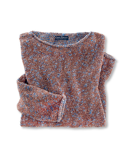 Ein Look wie ein Spaziergang am Küstenpfad: die weite Jeans in Meeresblau, dazu eine Blümchenbluse, die wirkt wie eine wilde Sommerwiese im schottischen Hochland. Darüber der leichte Pullover in Braun und Azur mit einem Hauch Glitzer, wie die Landschaft im Abendlicht. Und dazu die Docksides – hineinschlüpfen und an Ginsterbüschen vorbeigehen, in Richtung Leuchtturm, mit salziger Luft in der Nase.