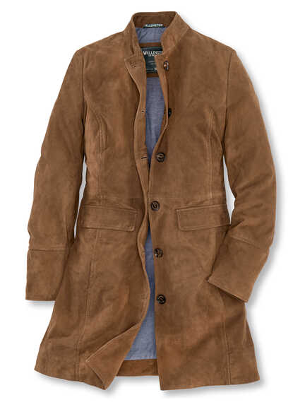 Der Ledermantel aus Ziegenvelours ist so weich wie ein Streichelzoo zum Anziehen. Das warme Rehbraun passt zu allem, die schlanke Silhouette macht sofort eine gute Figur.