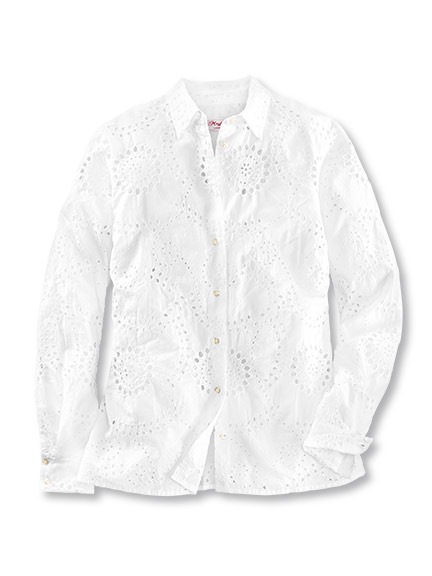Die Bluse mit Lochstickerei lässt Luft und Licht durch, wie eine sanfte Sommerbrise zum Anziehen. Dazu eine helle Hose, locker und unkompliziert, bereit für Wege am Wasser oder entlang der Küste.