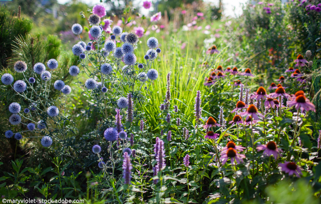 Die Mischung aus duftenden Stauden, Kräuterpflanzen und Gemüse lockt nützliche Insekten an. Während das Zusammenspiel verschiedener Pflanzenarten es Schädlingen erschwert, die Orientierung zu behalten. Beides im Zusammenspiel: Nützlinge und Blütenvielfalt machen Pestizide überflüssig. Wer verblühte Stauden im Herbst stehenlässt, bietet Gartenvögeln im Winter natürliche Nahrung – ein Beitrag zur Langlebigkeit des Ökosystems.